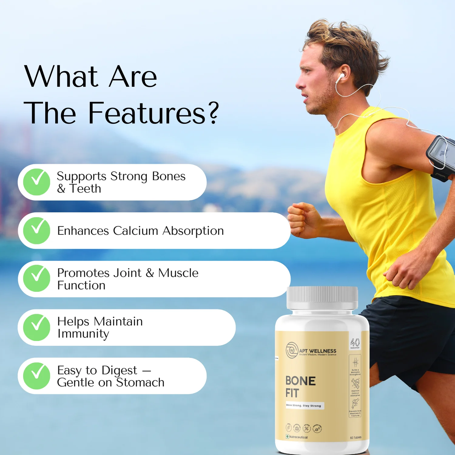 Bone Fit is a daily calcium and bone health supplement designed to improve bone density, support calcium absorption, and enhance skeletal strength. Formulated with Calcium Citrate, Magnesium, Vitamin D3, and Zinc in bioavailable forms. Vegetarian, clean-label formula.